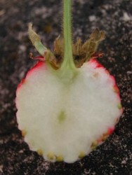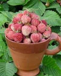 1x PER JAAR ZEER BEPERKT BESCHIKBAAR, WE WERKEN AAN DE OPBOUW VAN VOORRAAD. Al  sinds 1766 (sommige bronnen spreken over 1802) vinden we deze selectie van de muskusaardbei (grote bosaardbei) bij kwekers in Frankrijk. Het heerlijke aroma komt vrij als de vruchten volledig rijp zijn: ze zijn dan wit met rood, wat roze tot eindresultaat heeft. De vruchten zijn niet alleen geschikt voor verse consumptie, maar ook voor desserts, de lekkerste aardbeiencake en als origineel gekleurde vruchtjes in bowl. Veel muskusaardbeien zijn aangewezen op kruisbestuiving, dit ras draagt echter ook volop vruchten in zijn eentje... ze zijn echter zo lekker, dat een veldje met deze historische aardbei niet te versmaden is! Deze prachtige Franse beschrijving vonden we: "Son fruit est d’une couleur rouge violacé ou lie de vin ; chair très pleine, juteuse, beurée et fondante, blanche ou légèrement jaune, à saveur très prononcée rappelant un peu celle de la framboise ou plutôt du cassis".