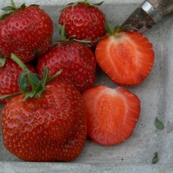 MINSTENS 1X PER JAAR VOLOP BESCHIKBAAR. (1955) Nederlands vroeg ras met redelijk recente papieren! Opvallend zijn de zeer grote vruchten (15-20g). De planten zijn behoorlijk ziekteresistent, groeien krachtig en zijn productief. De vruchten zijn stevig, sappig, kruidig, iets aromatisch en zachtzuur, lichtrode inwendige kleur. (bnkk)