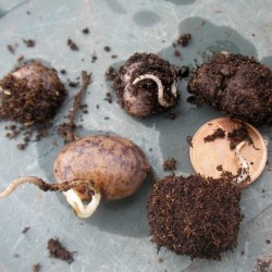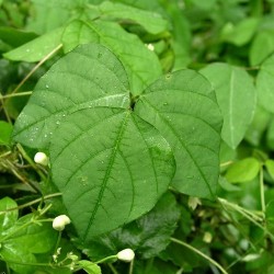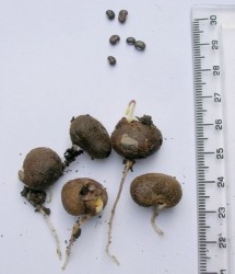 Een snelgroeiende kruip- of klimplant met de bijzondere eigenschappen van een echte tropische pinda! De laag ontstane bloemen richten zich na bevruchting naar de grond: net onder de grond groeit vanuit elke bloem een “nootje” van 1-2 cm groot, die een dun schilletje heeft. Na pellen kunnen ze rauw, gebrand of gebakken worden gegeten: een frisse nootsmaak met een tintje bonenaroma. De hoger bloeiende bloemen vormen peultjes met enkele echte zaden, die net als linzen kunnen worden gekookt. Het blad is driedelig en de lila bloemetjes groeien in trosjes. Omdat de plant vlinderbloemig is, wordt stikstof gebonden aan de worteltjes, die eventueel door buurplanten wordt gewaardeerd, een combinatie met stevig groeiende andere planten zoals maïs o.i.d. (let op voor overwoekering) is daarom heel nuttig. Het oogsten is een geduldig klusje! De plant is goed winterhard in ons klimaat (zone 7), houdt van schaduw (bosplant) en humeuze grond.