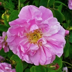 Het parfum van deze beroemde geurroos uit het Midden-Oosten wordt zeer gewaardeerd, de complexe geur wordt veroorzaakt door maar liefst 275 stoffen in de bloem! De x damascena is een (spontane?) kruising tussen Rosa gallica en Rosa moschata (met ook nog wat DNA uit de Rosa fedtschenkoana) en was in de Romeinse tijd al bekend. In de 13e eeuw zijn de planten door kruisvaarders meegenomen naar Noord-Europa. Door de latere bloei volgt dit soort de Rosa gallica op. Pluk de bloemblaadjes, laat ze drogen en ziehier: voor maandenlang rozengeur (en maneschijn?) in uw huis. Van verse rozenblaadjes geef je thee een heerlijke zoete afdronk. Samen met wat honing geeft dit extra heling en verzachting bij keelpijn. In de tuin zal deze roos nauwelijks last hebben van ziekten, mits je ze goed zonnig en het liefst op een verhoogd plantenbed plaatst. De hoogte is 60-90 cm, bloeitijd juli-september.