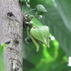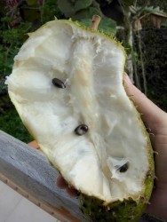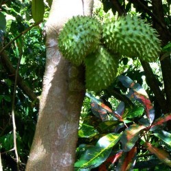 Een hele bekende, tropische vruchtboom. Alle delen van de boom worden medicinaal gebruikt. Op internet staan alle toepassingen: indrukwekkend! Het blad is tamelijk groot, glanzend, lancetvormig. De witte bloemen komen rechtstreeks uit stam of takken. Daaruit groeien imposante vruchten (tot 30 cm lang), lichtgroen en bezet met decoratieve stekels. Het wittige vruchtvlees is sappig en zuur: heerlijk in bijv. ijs en frisdranken. Of de plant (bij ons een kamerplant, die ‘s zomers naar buiten mag) hier vruchten draagt is me niet bekend, maar het avontuur is de moeite waard!