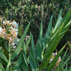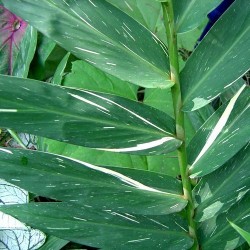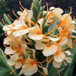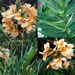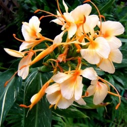 Veel gemberplanten bloeien prachtig, maar als deze beauty bloeit valt je mond werkelijk open... Het mooie (meestal subtiel) wit gevlekte blad is al het eerste dat opvalt. De grote bloemtros staat op een stevige, 120-150 cm lange stengel en draagt tientallen, zacht geurende, wit met zalmoranje bloemen. Het ras is een kruising tussen H. flavum en H. coccineum, die is uitgevoerd door Dr. Moy uit de Botanische Tuinen in San Antonio (Texas). Deze gember is niet eetbaar, zet de planten ‘s winters binnen en ‘s zomers buiten op een deels zonnig plekje.