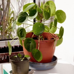 Het modeplantje van na 2015...! Zelfs wij ontkwamen er niet aan om deze af en toe in huis te halen. Ik ken het plantje al minstens 40 jaar, het is vooral de combinatie van grappige vormgeving en slimme naam, waarom iedereen er eentje wil hebben. Geef ze een licht plekje, in de zomer mogen ze ook buiten, de plant kan heel veel hebben behalve te lang natte voeten. Omdat het plantje zich gemakkelijk uitzaait in eigen potje, kan je al snel jonge plantjes “oogsten” en doorgeven! De ronde blaadjes, die op een grappige manier (aan de onderkant) op het steeltje zitten hebben kennelijk geïnspireerd tot de naam Pannenkoekplantje, hoewel ik Pizzaplantje meer op zijn plaats vind… Overigens is niets eetbaar aan de plant.