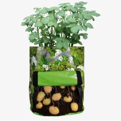 Op elk terras, ja zelfs op je platte dak of balkon kunnen aardappels groeien! Dit is een eenvoudige, maar sterke nylon geweven, buisvormige zak met de fotoafdruk van een aardappelplant. De afmeting is ongeveer 34 cm doorsnee en 45 cm hoog, zodat een inhoud van 45 liter beschikbaar is. Vul de zak eerst met een laagje hydrokorrels voor drainage, vervolgens met 15 cm (eventueel biologische) potgrond. Nu plant je 3 aardappels en bedek deze met grond. Elke keer als de plant boven de grond uitgroeit mag weer aarde worden aangevuld, tot 10-15 cm onder de bovenrand. Na enkele maanden groei kan je vanaf de zijkant kijken of er al iets te oogsten valt, je opent gewoon het “luikje” dat met klittenband vastzit. Wel de zak een beetje schuin houden om te voorkomen dat er grond uitvalt... Om tussendoor de aardappel-groeizak te verplaatsen is deze voorzien van 2 stevige hengsels.