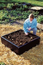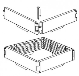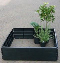 Met 4 zwarte, oersterke panelen van 100% recycled materiaal bouwt u in een paar minuten een superstevig verhoogd bed van 1x1m en 25cm hoog. Plaats het op een vlak stuk van de tuin en vul het met de grond uit de tuin, die evt. wat extra bemest wordt met compost. De voordelen op een rijtje: eerder opgewarmd dus grotere oogst en betere doorgroei, wortelgewassen zoals aardappels zijn gemakkelijk oogstbaar: de pinnen uit de hoeken, panelen weg en de aardappelen rollen als het ware de kist in! Zoete aardappelen doen het ook goed. De panelen zijn stapelbaar, dus het verhoogde bed is op te bouwen tot een hoge bak, ideaal voor tuinieren op hoogte of om compost in te maken. Inhoud 250 liter.