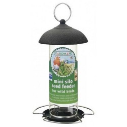 Mini voedersilo met ronde plexiglas wand met openingen naar voederplateau, een gegalvaniseerd zwart dakje en aanvliegbeugels. Afmeting 6,5 x 20 cm