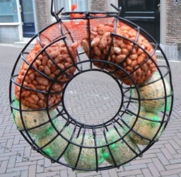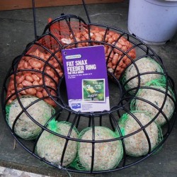Metalen voederhouder met vulopening voor maximaal 10 vetbollen/mezenbollen en metalen ophangbeugel. (geleverd wordt zonder inhoud)