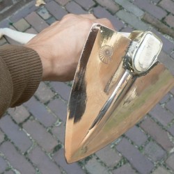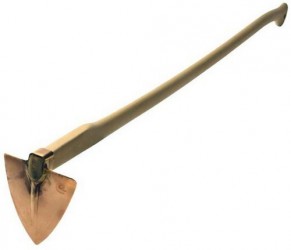 Mooi universeel stuk bronzen tuingereedschap, licht in gewicht en goed gebalanceerd. Om de grond los te maken en het onkruid weg te hakken. Voor het maken van zaadgeulen en het aanaarden van bijvoorbeeld aardappelen. In veel landen is dit model al eeuwen in gebruik als spitgereedschap. De steel is van lindehout. Lengte:128 cm, breedte: 14 cm, hoogte 19 cm, gewicht: 900 g.