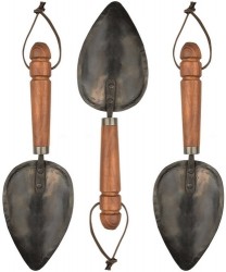 Oerdegelijk handschepje, halfrond met een bladmaat van 17 cm en een totale lengte van 34 cm. Dit schepje is geschikt voor het graven van kleine plantgaten, waarna je een plantje in de grond zet. Verder kan je er in geringe mate (pot)grond mee verplaatsen of omscheppen. Het gesmede ijzer kan roesten, dus na gebruik schoonmaken en insmeren met plantaardige olie.